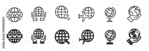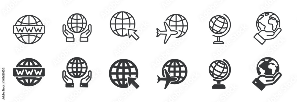 The watermark will not be included on Sticker.: Globe and network line and glyph solid icons collection - minimal icon and symbol series vector illus