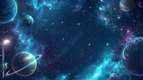The watermark will not be included on Sticker.: Glowing cosmic frame with twinkling planets and constellations in deep galaxy background