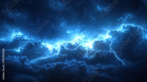 The watermark will not be included on Sticker.: Glowing electric blue clouds with lightning flashes illuminating a dark, star-filled sky creating a