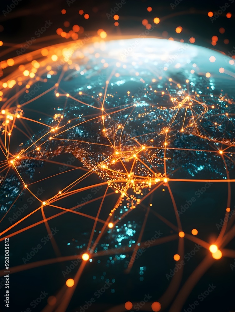 The watermark will not be included on Sticker.: Glowing global network of interconnected energy and data points across the night sky