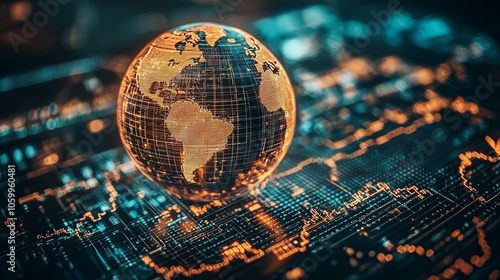 Glowing globe representing globalization in finance, surrounded by digital data and networks, symbolSticker