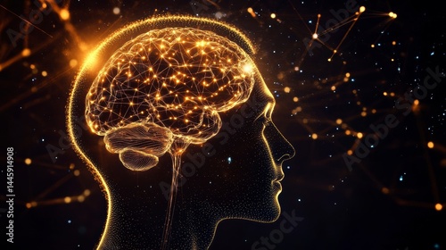The watermark will not be included on Sticker.: Glowing human head profile with interconnected brain neurons and neural pathways -
