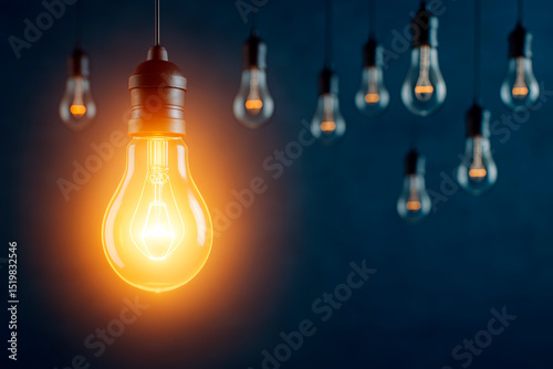 The watermark will not be included on Sticker.: Glowing lightbulb symbolizing creative idea and innovation on dark blue background with multiple bul