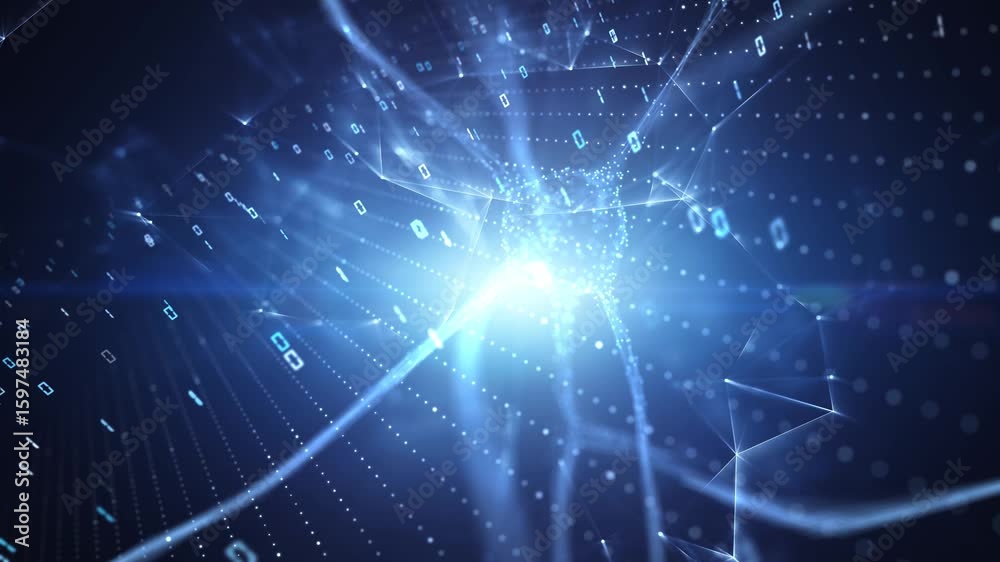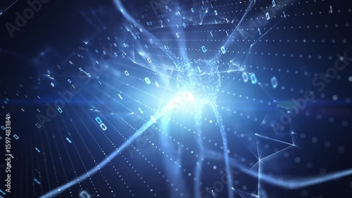 Sticker : Glowing neuron cell on futuristic shiny digital technologt network with binary code data background -