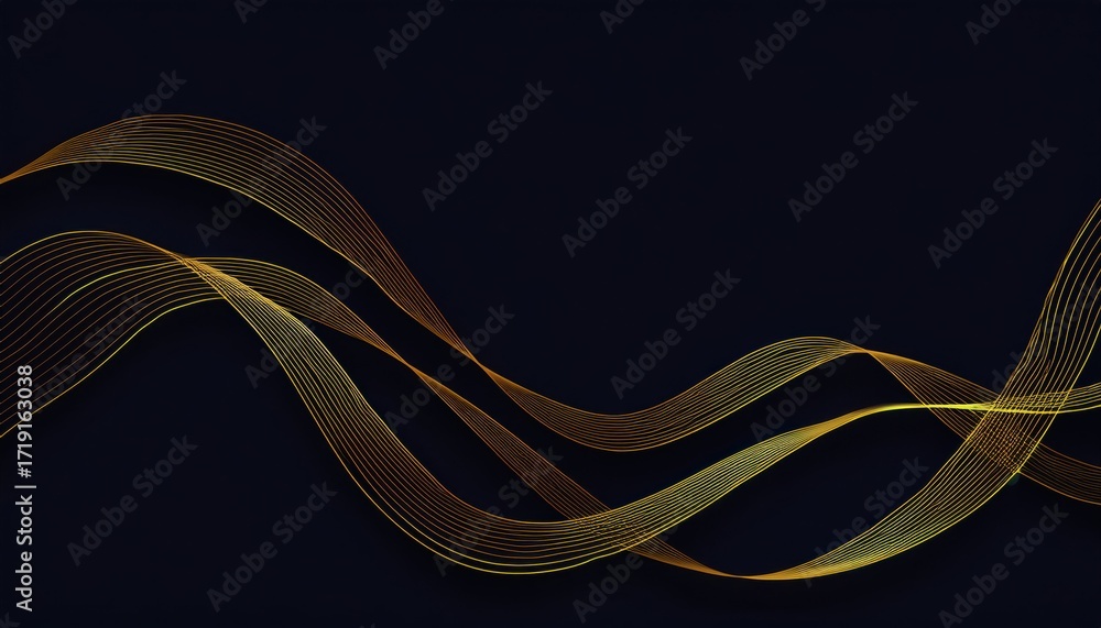 The watermark will not be included on Sticker.: Golden abstract wave lines flowing across dark background with smooth gradient, modern futuristic te