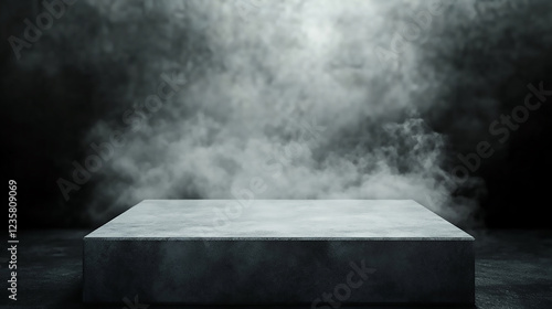 The watermark will not be included on Sticker.: Gray textured concrete platform, podium or table with smoke in the dark empty table with smoke
