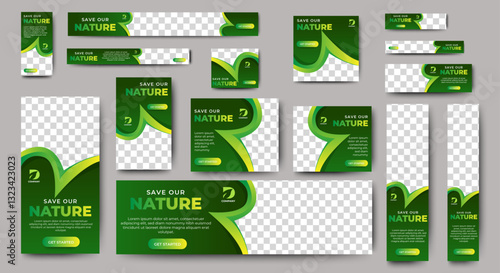 Green banner design web template set, horizontal header web banner - modern gradient green cover headSticker