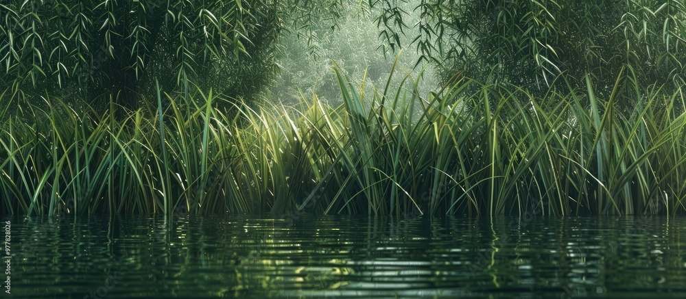 The watermark will not be included on Sticker.: Green reeds reeds at the water s edge near the woods - copy space image - place for adding text and de