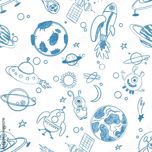 The watermark will not be included on Sticker.: Hand drawn earth - seamless children's pattern with space elements - doodle sketch of space elements -