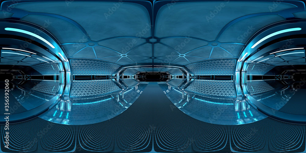 The watermark will not be included on Sticker.: High resolution hdri panoramic view of dark spaceship interior - 360 panorama reflection mapping of a