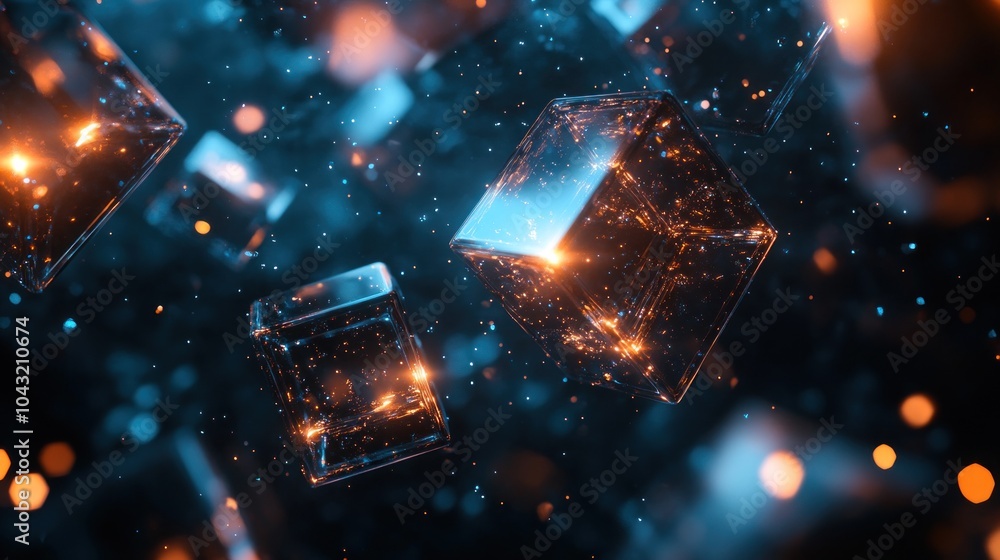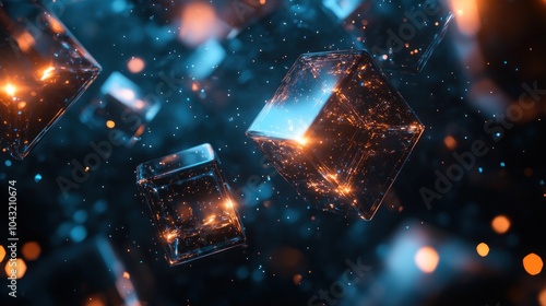 The watermark will not be included on Sticker.: Holographic geometric shapes floating in a black void with subtle reflections and glowing edges