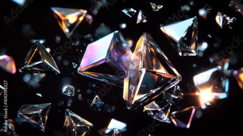 The watermark will not be included on Sticker.: Holographic geometric shapes floating in a black void with subtle reflections and glowing edges