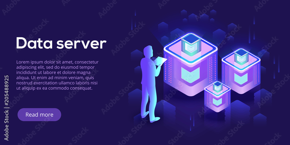 The watermark will not be included on Sticker.: Hosting server isometric vector illustration - abstract datacenter or blockchain with man background -
