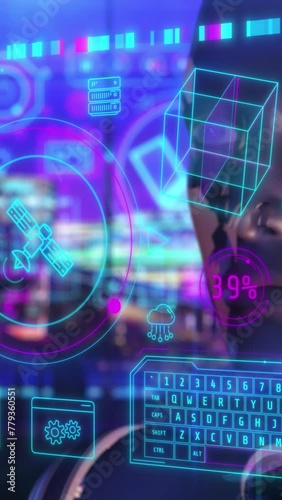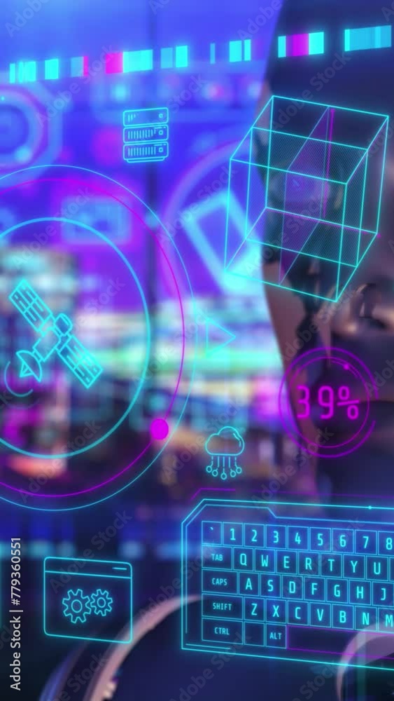 The watermark will not be included on Sticker.: Infographics on the virtual panel in front of the android -