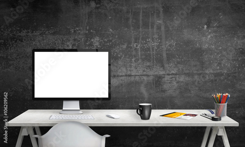 Sticker isolated computer display for mockup in office interior. work desk with keyboard, mouse, cup of coff