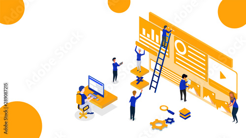Isometric illustration of business people maintaining the website or analyst analysis data for teamwSticker