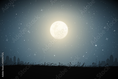 The watermark will not be included on Sticker.: Landscape with tall grass on starry night - city buildings under moon