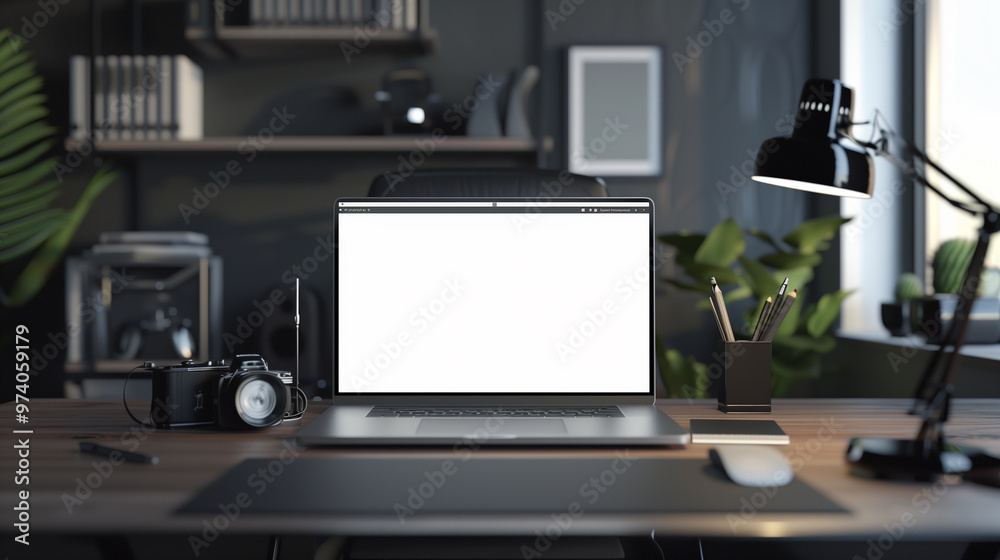 The watermark will not be included on Sticker.: Laptop screen mockup placed on a desk, with a modern workspace setup in the background to showcase a