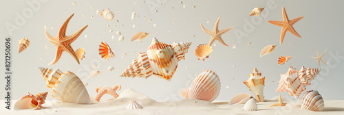 Levitating seashell and starfish in warm light with dynamic motion and sand particles banner - panoraSticker