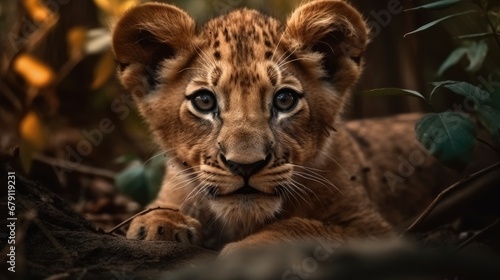 The watermark will not be included on Sticker.: Little lion in the forest - created with generative ai -