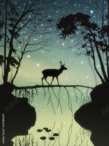 Sticker lonely deer in misty forest. animal walk on fallen tree. starry night.