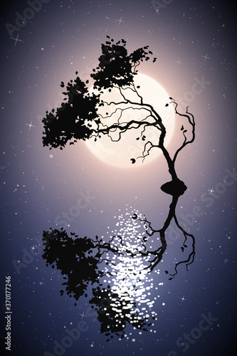 Sticker : Lonely tree on moonlight night - landscape with full moon in starry sky