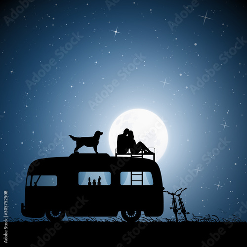 The watermark will not be included on Sticker.: Lovers and dog on roof of retro car on moonlit night - vector illustration with silhouette of couple