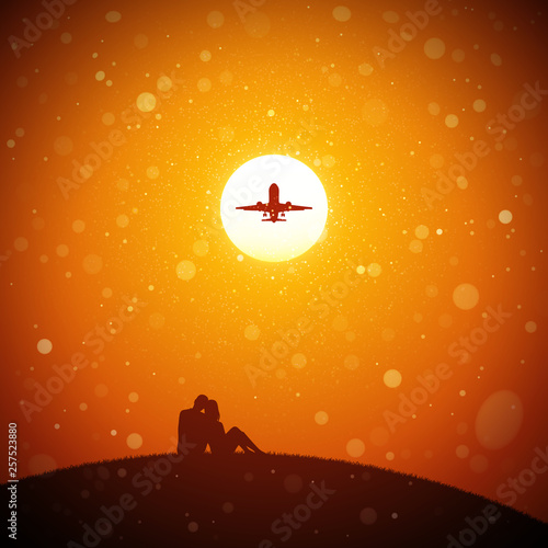 Sticker : Lovers and flying aircraft at red sunset - vector conceptual illustration with silhouette of couple s