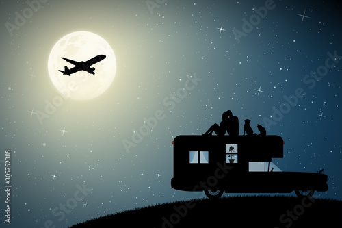 The watermark will not be included on Sticker.: Lovers and pets on roof of retro car on moonlit night - vector illustration with silhouette of couple