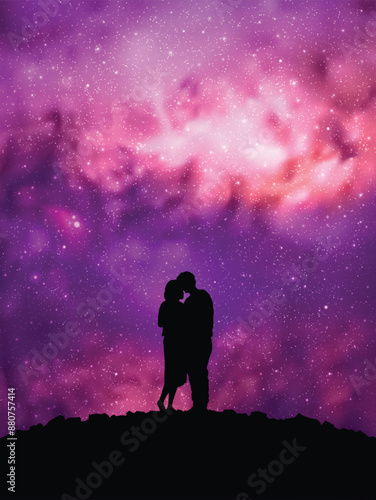 The watermark will not be included on Sticker.: Lovers embrace on top of mountain - romantic night sky with pink nebula