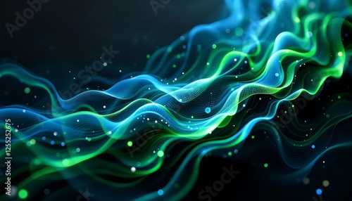 The watermark will not be included on Sticker.: Luminous digital flow of data streams in shades of blue and green