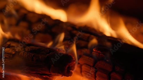 The watermark will not be included on Sticker.: Macro view of burning wood, charring slowly with intricate patterns of flame transformation, burning