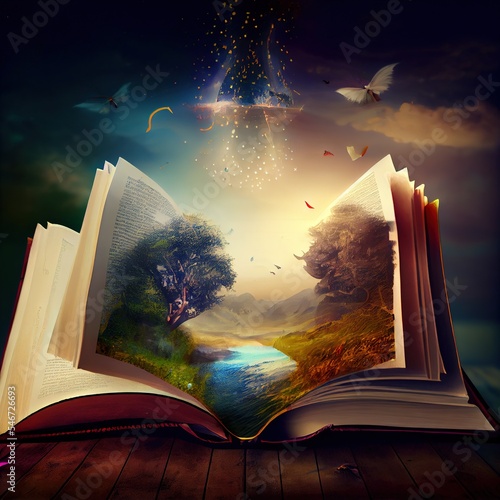The watermark will not be included on Sticker.: Magical world expanding out from an open book, discover the joys of reading