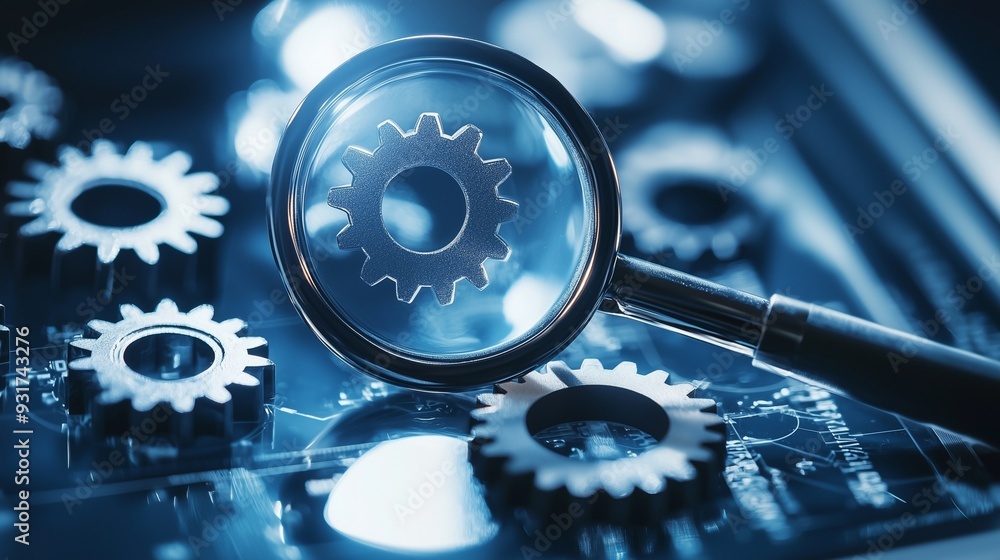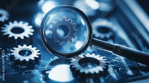 The watermark will not be included on Sticker.: Magnifying glass over gears symbolizing seo tools and analysis - search engine optimization efficienc
