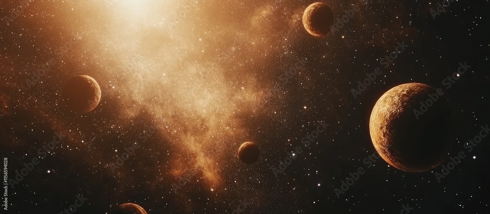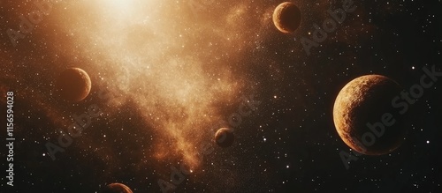 The watermark will not be included on Sticker.: Majestic outer space scene featuring multiple planets and sparkling stars with vibrant cosmic clouds