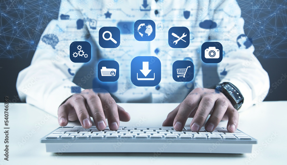 Man using computer - app icons with a download symbol - development of applications - social networks aSticker