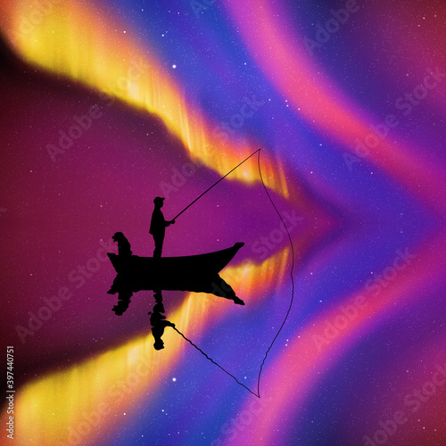 Sticker man with dog in boat at night. fisherman silhouette. aurora borealis