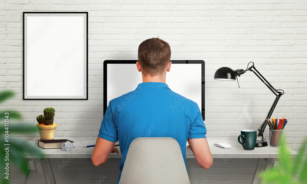 Sticker : Man work on office computer with isolated screen for mockup - modern office interior with isolated po
