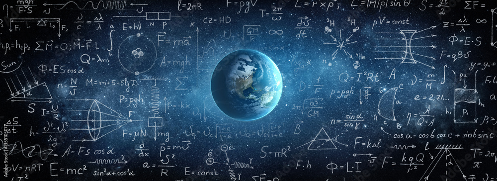 Mathematical and physical formulas against background of a earth in universe - space background on thSticker