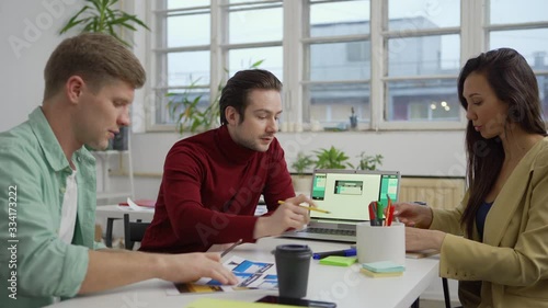 The watermark will not be included on Sticker.: Medium shot of designer presenting website interface templates for different devices on laptop scree