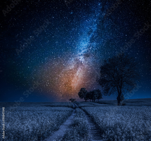 Sticker milky way and field with trees in summer