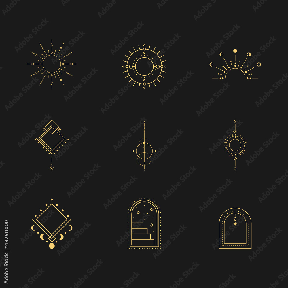 The watermark will not be included on Sticker.: Minimal boho linear symbols - set of celestial mystic element - vector line art illustration -