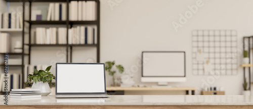 The watermark will not be included on Sticker.: Minimalist workspace close-up with a laptop mockup on a table in a minimal white office