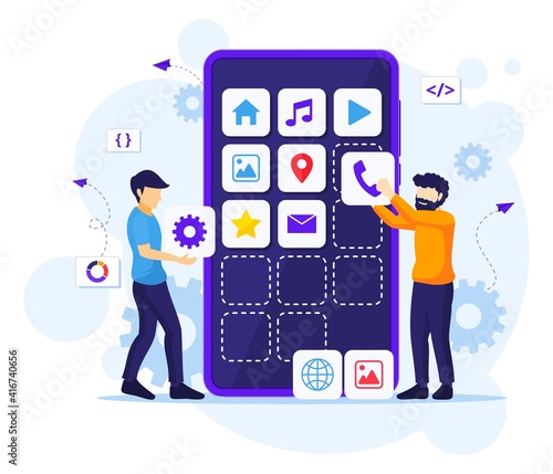 Sticker : Mobile app development concept, people building and create software application on a giant smartphon