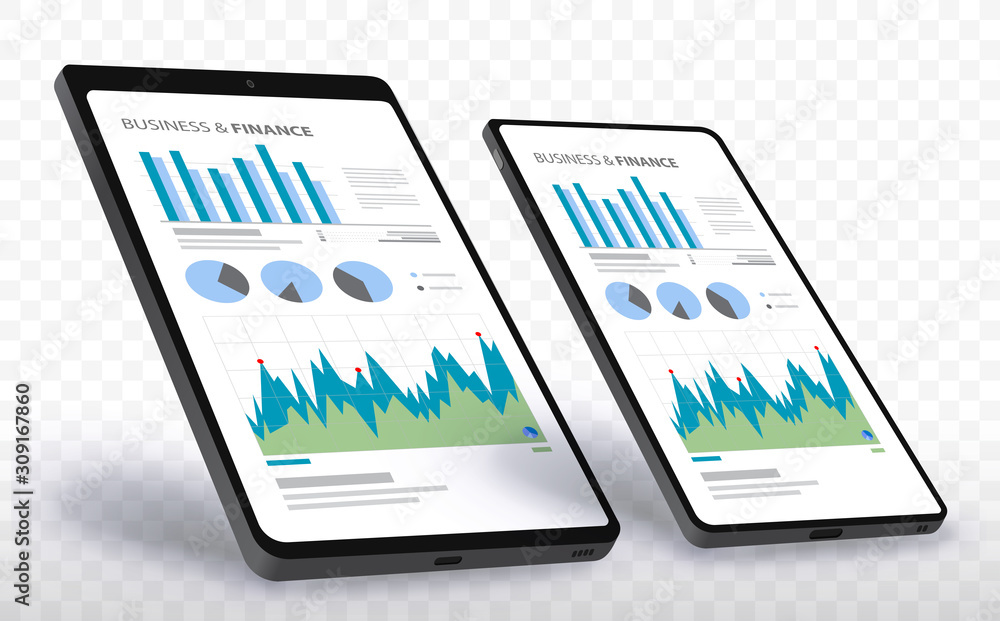 Sticker mobile phone and tablet computer screens with financial charts and graphs