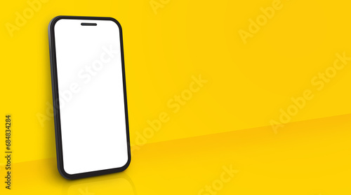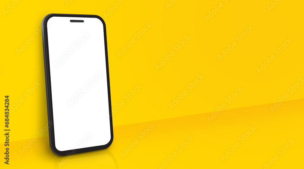 The watermark will not be included on Sticker.: Mobile phone mockup with perspective view on yellow background - blank smartphone screen includes cli