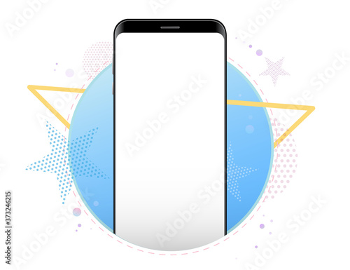 Sticker mobile phone vector mockup with geometric abstract background. frameless black smartphone front view