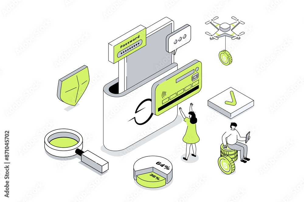 Mobile wallet app 3d isometric concept in outline isometry design for web - people managing financialSticker