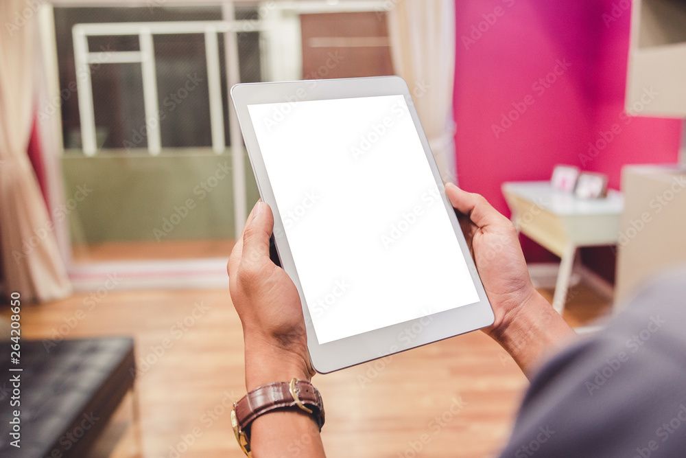 Sticker : Mockup tablet on businessman hands empty display on home table with blur background - - image - image