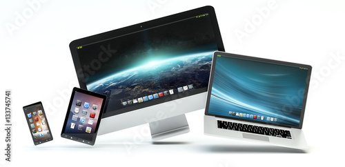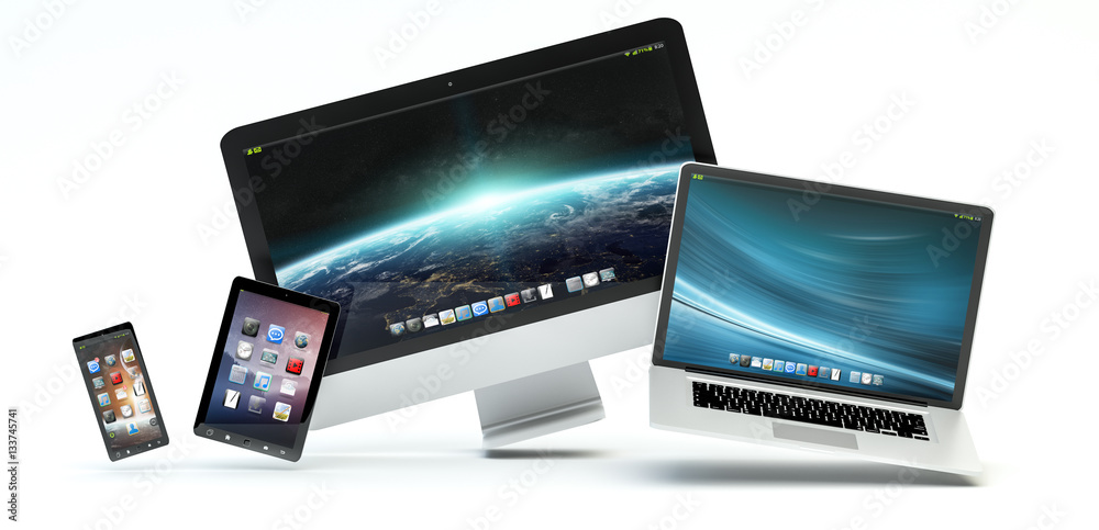 Sticker : Modern computer laptop mobile phone and tablet floating 3d rende